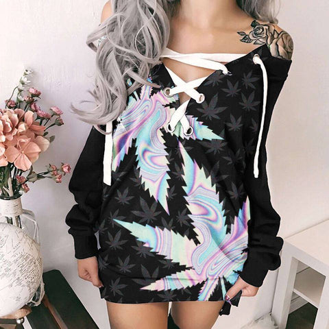 Hologram Cannabis Lace Up Sweatshirt For Women Marijuana 420 Weed Shirt Clothing Gifts HT